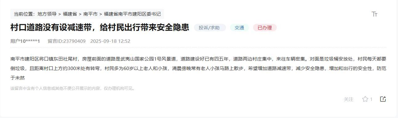 人民网南平10月18日电(记者刘宝琴)近日,福建省南平市游客通过“领导公告栏”反映,武夷山国家公园第一条景区公路途经简阳区江口镇东田舍围村,车流量不断增加。他们想在小镇入口处的道路上加设减速带,以降低安全风险。 《领袖公告栏》截图 你说第一风景道是一条双向单车道的道路,大概建于四五年前。村庄集中在道路两侧,车流量较大。 “距离城镇入口 50 或 60 米处有一个转折点,这造成了盲点。村民们每天都要过马路扔垃圾,早上和下午都是步行。”他建议在道路上安装减速带,让出行更加安全。沙尾村入口处,Do南平市简阳区江口镇吴田。武夷山国家公园第一风景公路全长251公里,途经武夷山市和简阳区11个镇、40个村,连接燕窝、青龙瀑布、皋亭书院等文化旅游“登记点”。 “风景第一公路建成后,交通更加便利,汽车数量也增加了。”他说,路两边的房子也都粉刷过了,乡下的生活环境越来越好。南平市通信接收办公室立即将杨先生的建议转达简阳区江口市人民政府。江口市政府高速公路站站长王金良表示,杨女士汇报后的第二天,简阳市交通局和江口市政府的主要领导记者前往东田沙尾村进行实地勘察,检查该路段的车流量和安全隐患。 “当天下午,在交通局的指导下,我们在射尾自然村路段安装了4个减速带和2个道路安全标志,将安全风险降到最低。”王金良说。进入城镇的道路上增设了减速带和标志。照片由江口市政府提供。江口市委书记廖建文表示,该市举一反三,在全市开展道路调研,重点分类划分车流量大、事故多发路段设置减速带的要求,加大对车流量大、事故多发路段的巡逻频次,强化交通安全管理。 “第二天晚上,我看到安装了黄色减速带。”钟友又来拜访我们,说:“处理速度太快了。”ve 陆军。 “镇口的风景路现在又漂亮又安全。”他高兴地说。