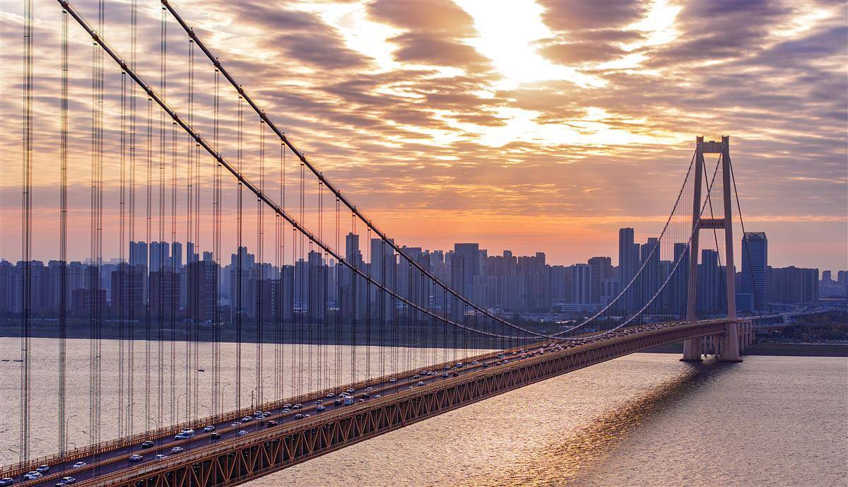 北风吹过,武汉上空出现黎明。长江上的长江大桥很漂亮。